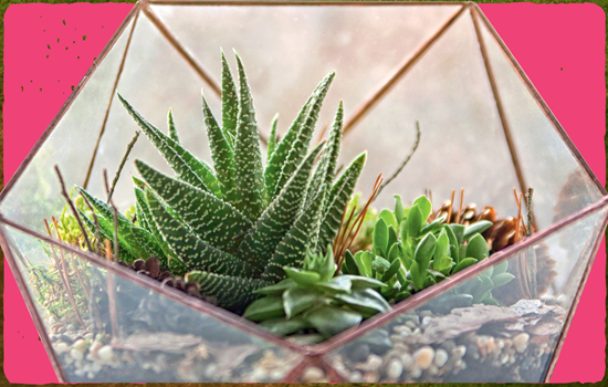 A terrarium is a small glass container with plants inside. Try making your own with some small plants such as succulents, ferns or moss.
