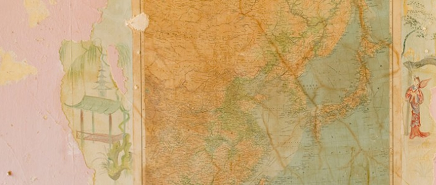 A number of delightful hand painted decorative illustrations were found that complimented the maps. Entirely whimsical and utterly delightful, they include komodo dragons, a geisha, elephants, gemstones, birds, coral and even a quetzacoatl – or a feathered dragon to you and me. There's also a lovely painted blue wave that follows the room around the whole edge, plus a cheerful art deco style sun which peeps out above them.