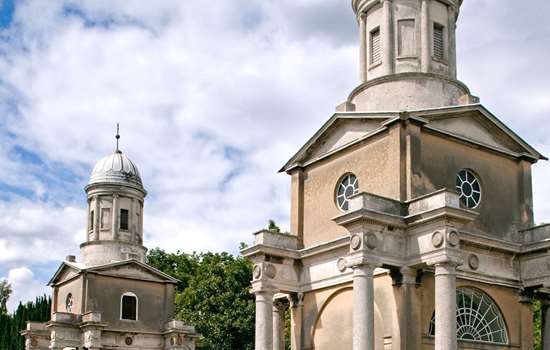 Two porticoed Classical towers, which stood at each end of a grandiose but highly unconventional Georgian church, designed by Robert Adam in 1776.