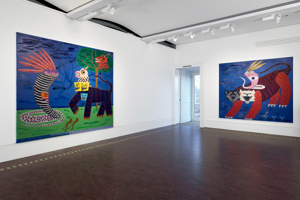 Kerwick’s brazen, colour saturated paintings transport you to a dream world of mythology, folk law and misadventure. The artist explores his own domestic family frivolity through the lens of alternative bodies or forms. Snakes, bears, wolves and tigers are juxtaposed with his favourite books, still life flowers, trees, and domestic arrangements within almost fairy-tale narratives. His two sons Sony and Milo for example are often represented as double headed beasts.