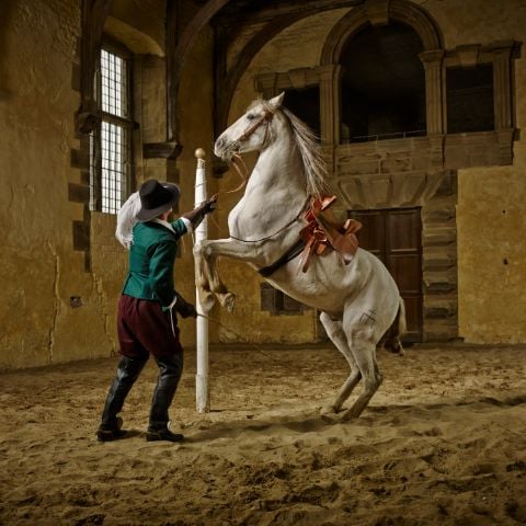 Witness expert horsemen in flamboyant costume, training for art and battle to music in the spectacular surroundings of the Riding School at Bolsover Castle.