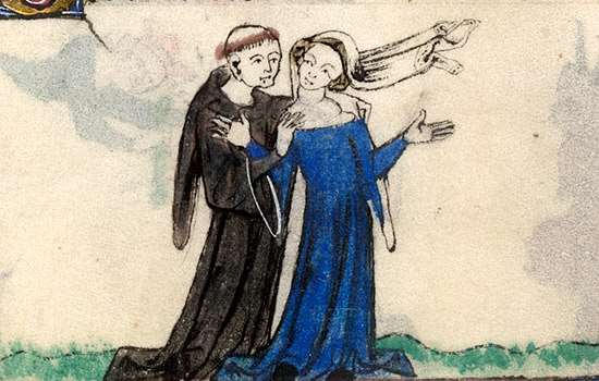 Image: A marginal drawing from a 14th-century manuscript showing a friar hearing a nun’s confession