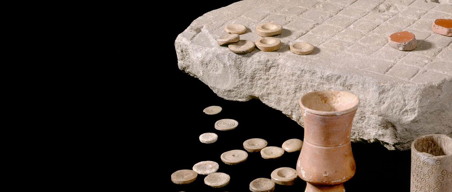 There are 689 gaming counters and 11 fragmentary gaming boards in English Heritage's collection from the forts and towns along Hadrian’s Wall alone. From these discoveries, we get a good sense of how Roman soldiers, civilians and families whiled away their spare time. Counters take many different forms: some slippery, bright glass, others carefully worked bone or pottery fragments rounded to an almost-circle. Many of the boards are fragmentary, so we cannot be certain of their original dimensions, which would allow a fuller understanding of gaming rules. It’s also possible that games would have been played on hastily etched boards on the ground or on buildings.