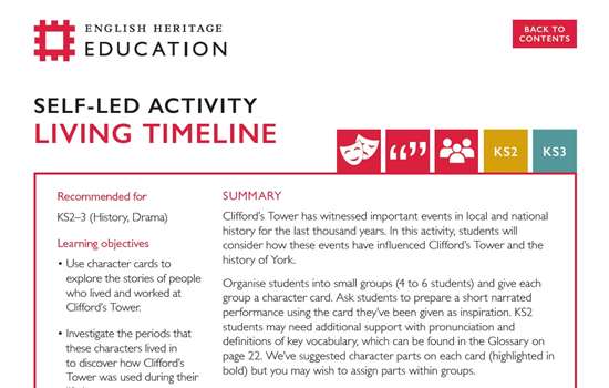DRAMA - Choose a character from the history of Clifford's Tower and prepare a short speech reflecting their experience of York Castle. You could use the character cards in our Living Timeline activity to help inspire you and perform your speech in character.