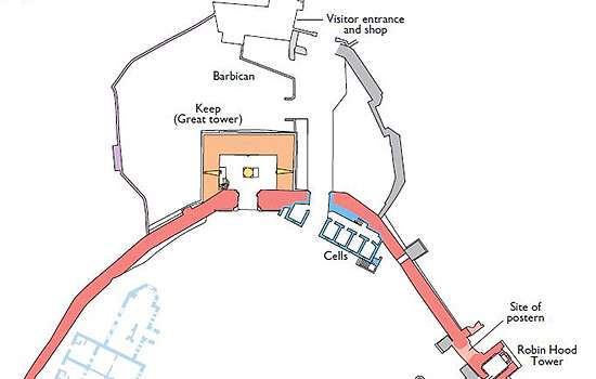 These frequent changes of ownership had little impact on the fabric of the castle, beyond ensuring that it was not much altered during this period. The only recorded works were undertaken in 1250 by Henry III and by Edward I after 1294.[12] In neither case is it clear what was done to the castle, but the evidence of the architecture suggests that Edward I’s work was more significant. He probably inserted the vault in the keep, renovated Scolland’s Hall, and extended the adjacent residential range along the east wall of the castle. Either Edward I or one of the 14th-century dukes was responsible for adding upper apartments to the Robin Hood and Gold Hole towers, and perhaps also the construction of the south-west tower.