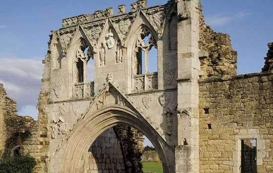 The priory’s great gatehouse was built in around 1300. The sculpted decoration includes the coats of arms of the de Roos family and several other powerful northern aristocratic families, showing that Kirkham could call upon influential supporters.