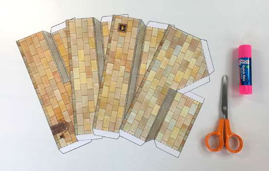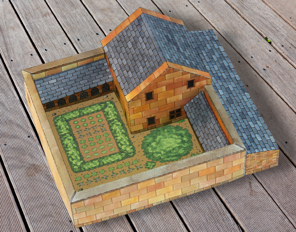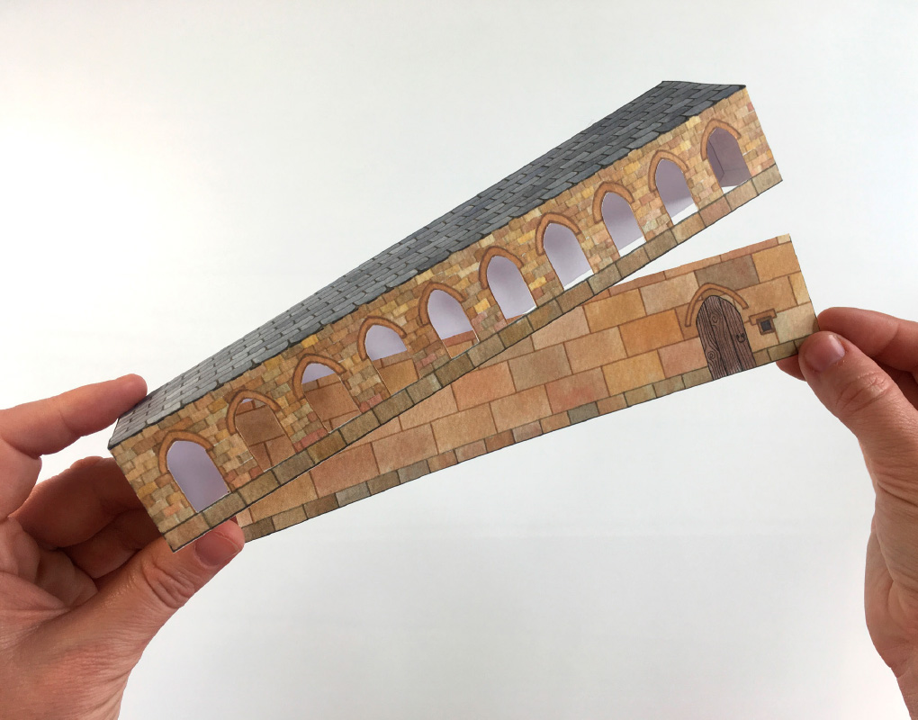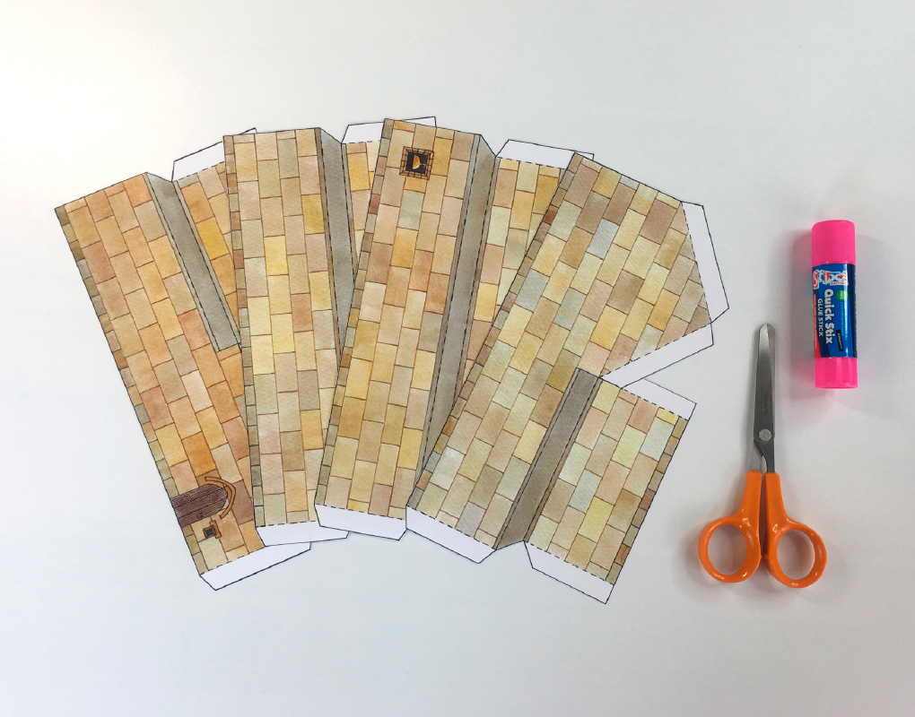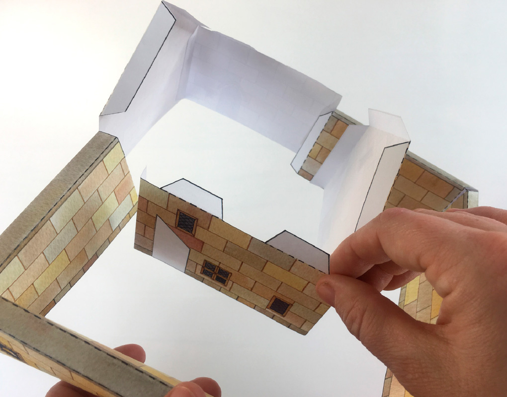 Fold the inner cell wall (E) in half and fold the tabs down at the top. Put glue on the side tabs and stick the cell wall in the corner of your garden, to create the main structure of the monk’s cell.