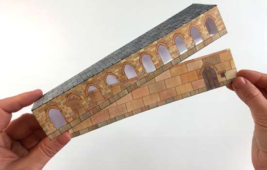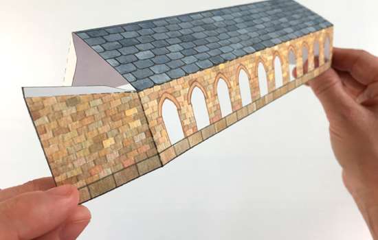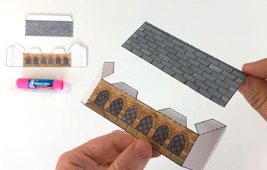 Fold along the dotted lines of the corridor walls and put glue on the top tabs. Stick the roof on to these tabs.