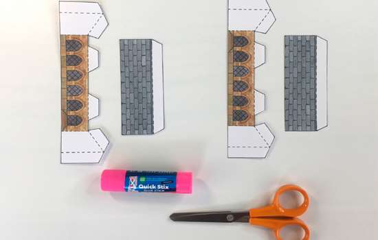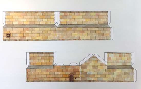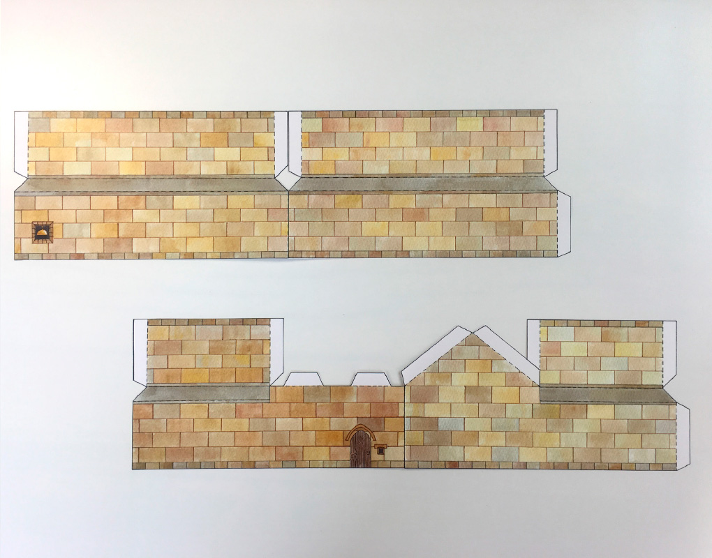 Repeat for the other corridor. Put glue on the tabs and stick them in place on to the sides of the monk’s cell. There is an outline on the side of the building to show you where to position them.