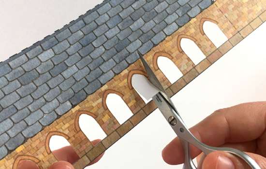 Cut out the exterior walkway (I). Using a small pair of scissors (nail scissors are ideal) cut out the windows.