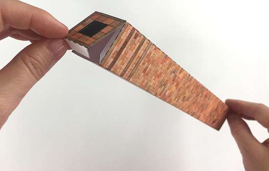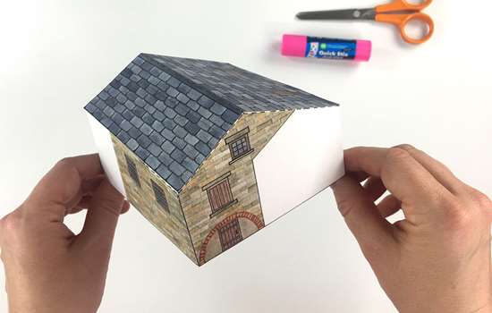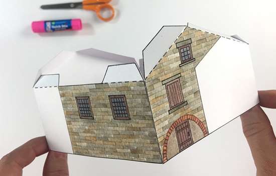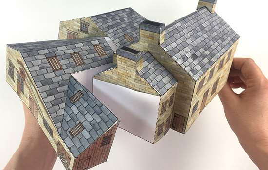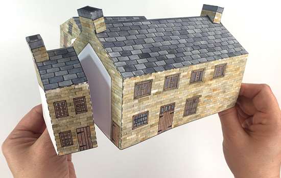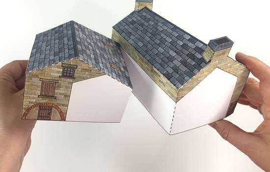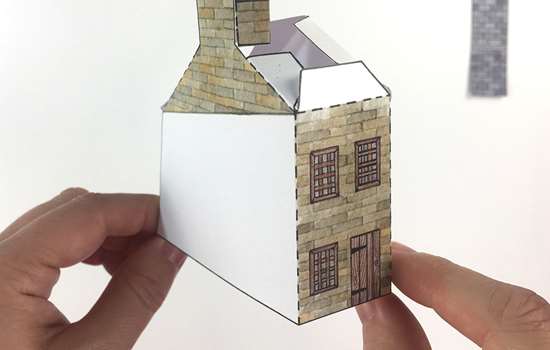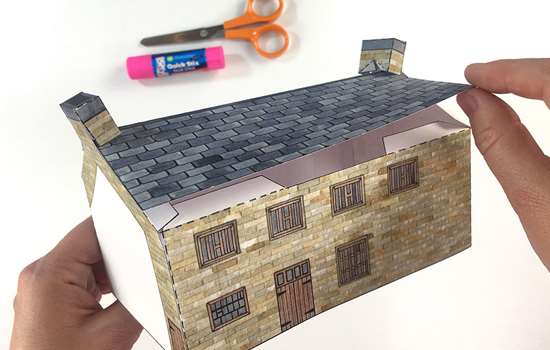 Fold B3 in half and glue to the tabs at the top of the walls to complete the boiler house.