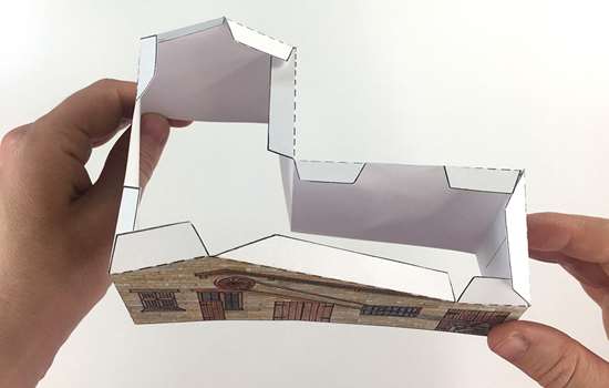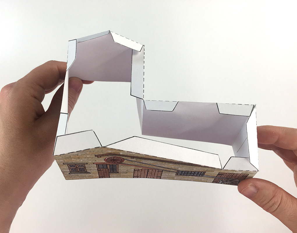 Next, we’ll make the new lathe shop, an L-shaped building that attaches to the boiler house. Join C1 and C2 together, fold along the dotted lines and bring the edges together to create the building.