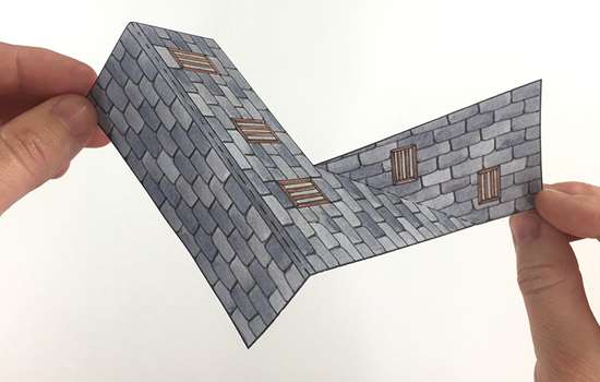 Fold along the dotted lines of C3 to create the roof. Mountain fold the long dotted line to create a roof shape, and valley fold the diagonal dotted line to create a V shape, as shown in the photo.