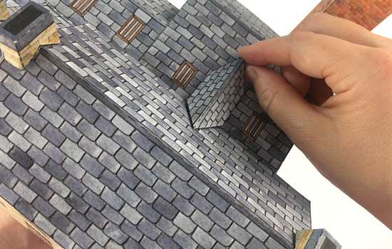Fold the roof of the old mill, A3, along the dotted line, and glue to the tabs at the top of the building to secure. Tuck it under the small triangle tabs at the bottom of the chimneys, putting a small blob of glue on these tabs if needed.