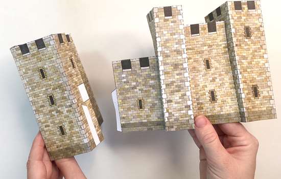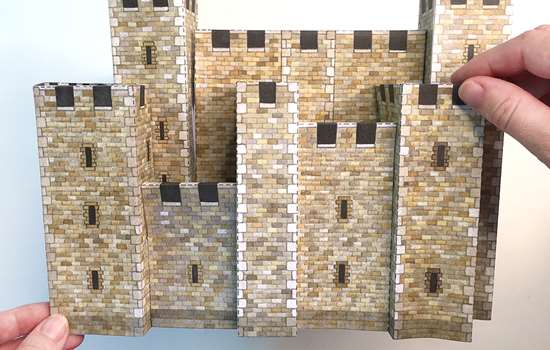 Now we need to join the four walls and the four towers together. The white areas on the towers correspond with the tabs on the side of the walls. Glue the walls on to these white areas. For extra strength, use tape as well. Work your way around until all the walls and towers are joined together.