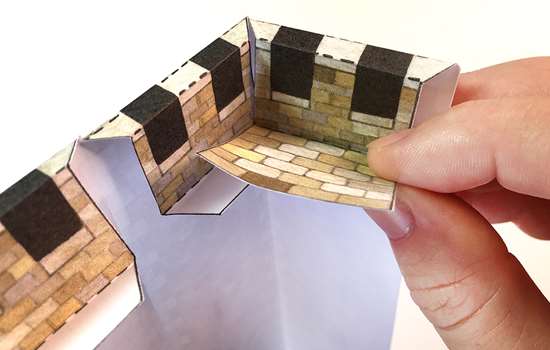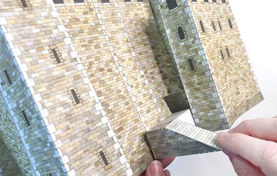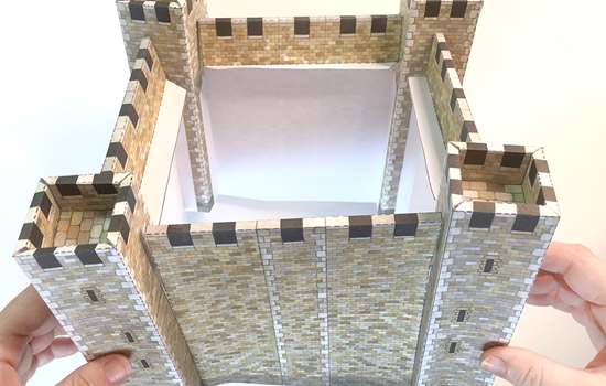 Put glue along the long horizontal tabs at the top of your castle walls and drop the roof in. You may find it helps to get your hand in underneath the model, so you can press the roof on to your castle walls. You’ll notice by adding the roof it’s become much sturdier.
