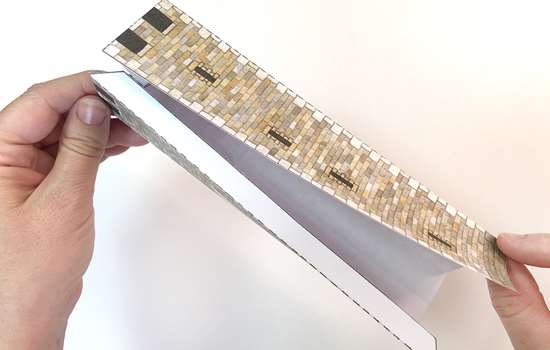 Next, we need to make the gallery that runs around the outside. Let’s start with part A, in the corner. Fold along the dotted lines and fold the lookout floor down to create a three-sided tower. Fold B the same way you did the castle walls, then attach B to A, using the white areas as a guide for where to stick.