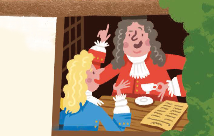 Image: a cartoon boy dressed in fine Stuart style clothes and hat with a feather holding a smart phone