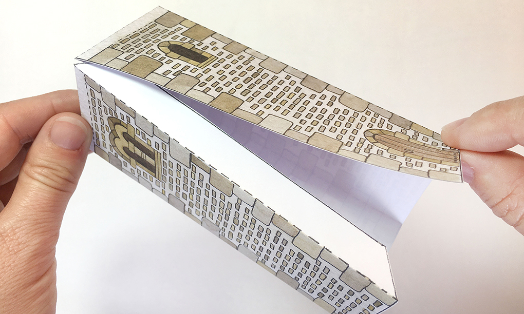 Using Pritt Stick, join the two walls together to make one long piece. Fold along the dotted lines, and fold round to create a rectangle. Secure together by sticking along the tab at the side.