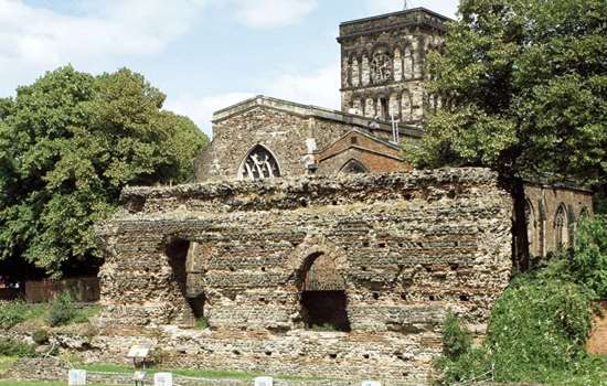 A length of Roman bath-house wall over 9 metres (30 feet) high, near a museum displaying the archaeology of Leicester and its region.