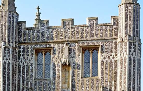 This pinnacled gatehouse, elaborately decorated in East Anglian 'flushwork', is the sole survivor of the wealthy Benedictine abbey of St John.