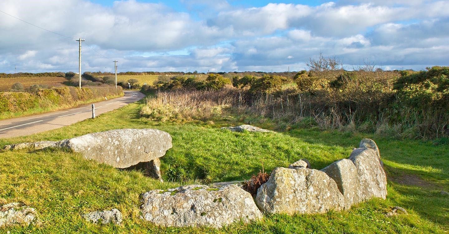 A Neolithic or early Bronze Age chambered tomb with an entrance passage, walled and roofed with stone slabs, leading into the central chamber.