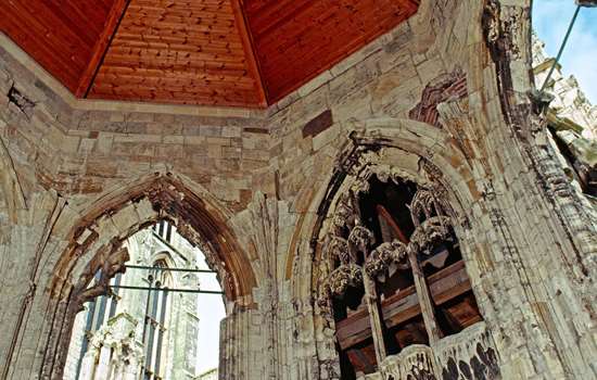 The elaborately decorated ruins of a 14th-century chancel and chapter house (viewable only from the outside), attached to the still operational cathedral-like minster church.