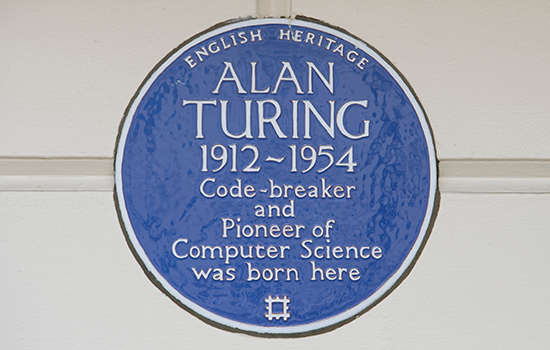 A blue plaque commemorates Turing's birth in a nursing home at Warrington Lodge, 2 Warrington Crescent, in Maida Vale.