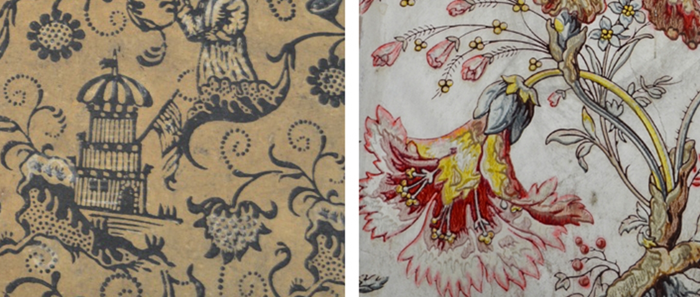 Detailing of Turkish figure and Japanese pagoda, Paradise Row c.1690 wallpaper. This is the oldest known wallpaper in the ASC.