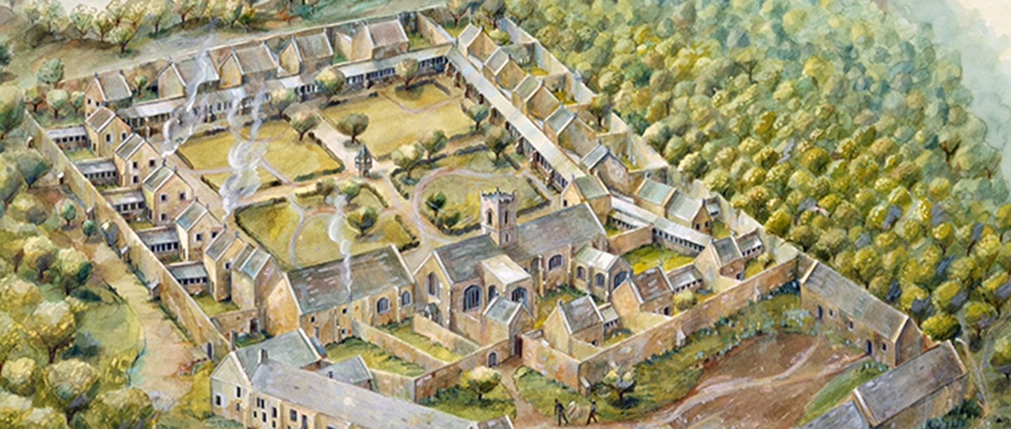Reconstruction drawing of lay brother bringing food to a monk’s cell by Ivan Lapper © Historic England Photo Library