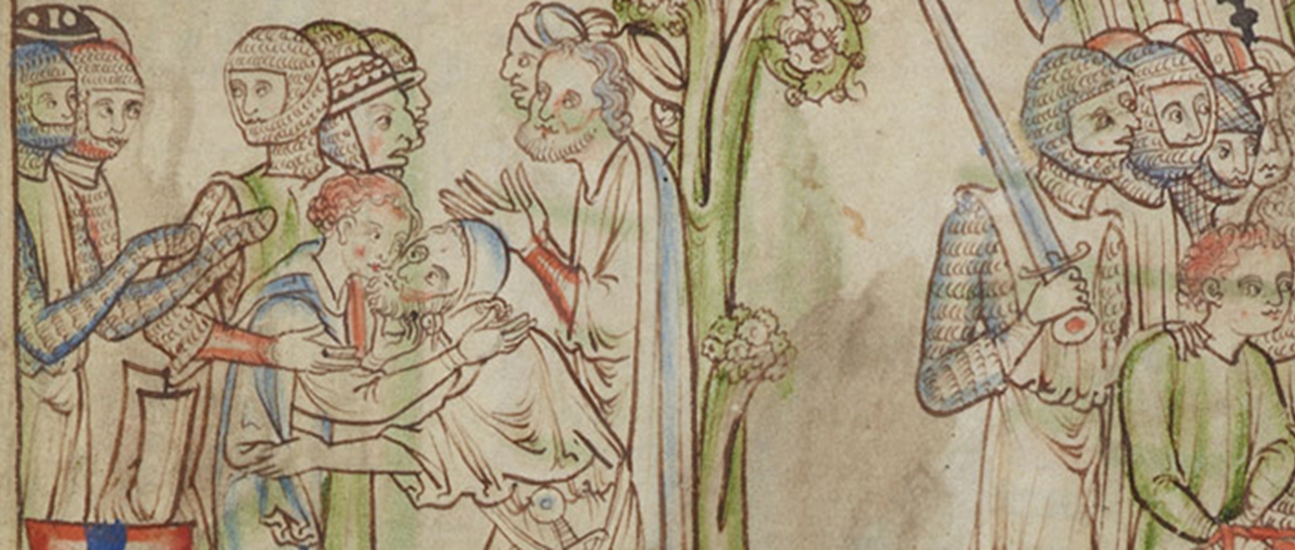 Earl Godwin embracing Edward’s brother Alured – from a C13th century version of the Life of King Edward owned by Cambridge University. A digital facsimile of the whole manuscript is available here. (Note: this is not the same version of Edward’s life as I discuss in this post but a later one which does not include the episode I mention.)