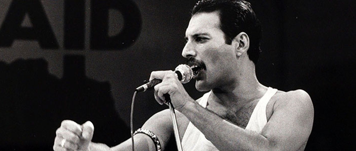 Freddie Mercury of Queen live at Wembley Stadium 1986