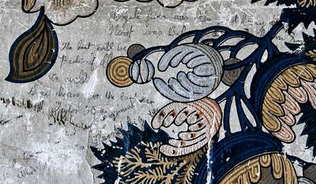 From diary evidence, we know the multi-coloured floral wallpaper in the west and east bedrooms of the hall was installed in the 1880s. It was manufactured using the block-printing process and was once thought to be either by Morris & Co, Jeffrey & Co or Essex & Co, all leading wallpaper makers of the time. However, the wallpaper width is not typical for English wallpapers, indicating it might have been of French origin. The paper has a bold chintz-style ‘tree of life’ pattern which appears to imitate crewel-work embroidery, a type of surface embroidery using wool.