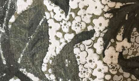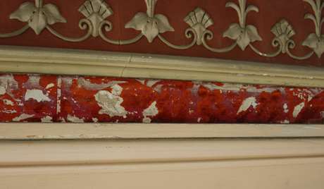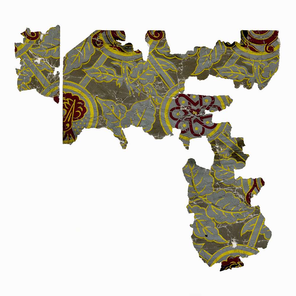 Small sections of the overpaint have flaked off to reveal what may be olive green and mandarin blue pigments in the original wallpaper, supporting the identification.