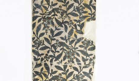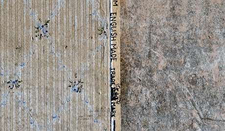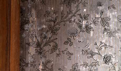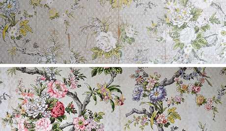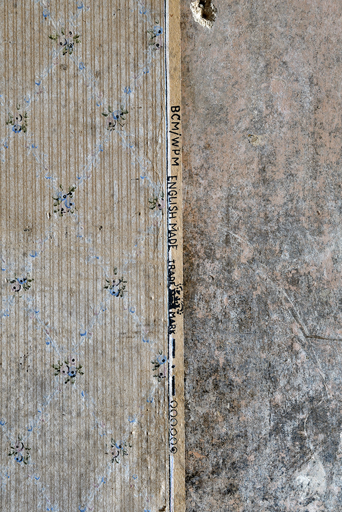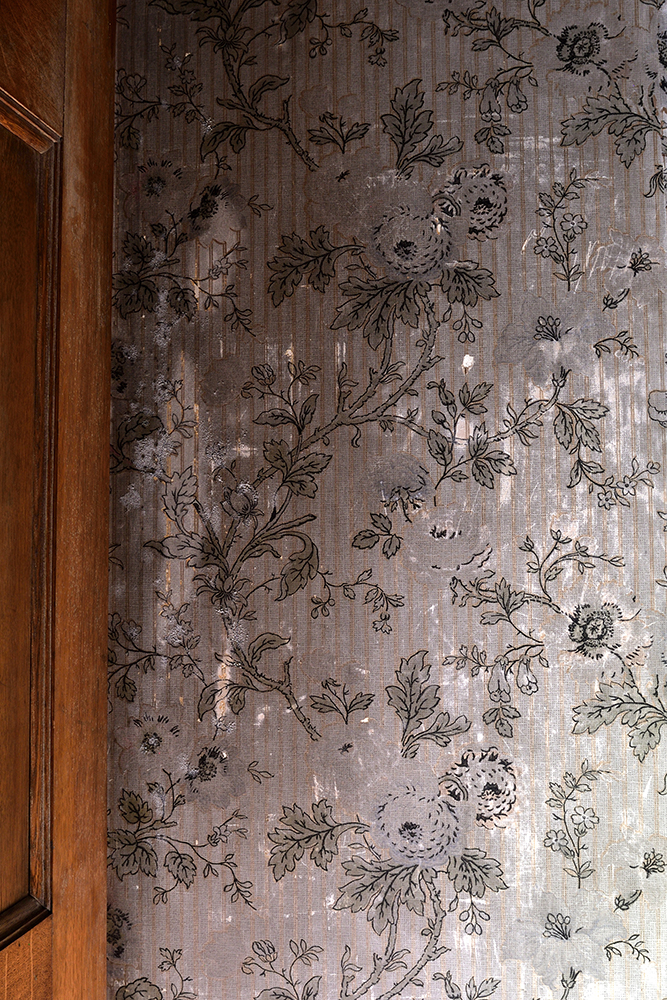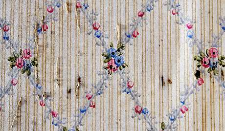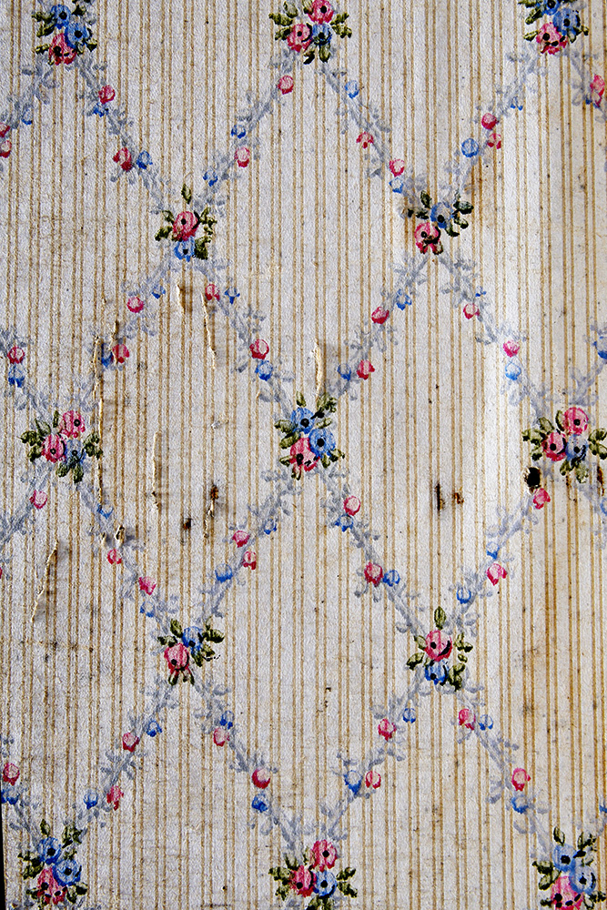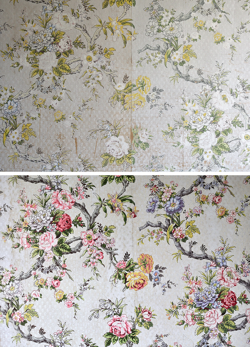 The sanitary wallpaper from the servants’ mezzanine hallway. The varnished early 20th-century paper with flower design is shown on the left and earlier paper from the end of 19th century is on the right