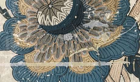 Fresh surface scratches and small areas of damage have been painted in and toned to match the wallpaper using watercolour pigments. Some sections were able to be washed with distilled water to improve their appearance and in some cases, paper fragments were lined with an internal support of Japanese tissue and either reattached to the wall or placed in archival storage.