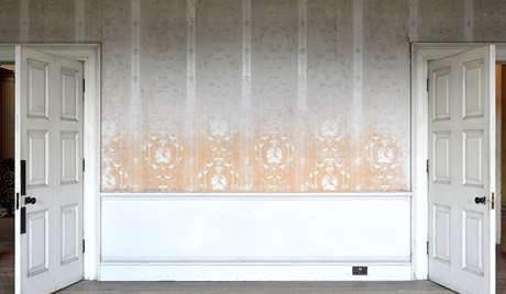 The original wallpaper in the ground-floor anteroom was painted over with cream coloured emulsion paint. In 1941, Sir Stephen Middleton, owner of Belsay Hall, wrote a letter to the estate manager asking him to arrange to ‘freshen up’ the anteroom, suggesting it was looking tired. The paint flattens the original appearance of this room, but we can glimpse the original pattern in certain areas, for example, above the mantelpiece, where the thickly printed pigments of the original wallpaper have left a raised pattern still visible under the paint.