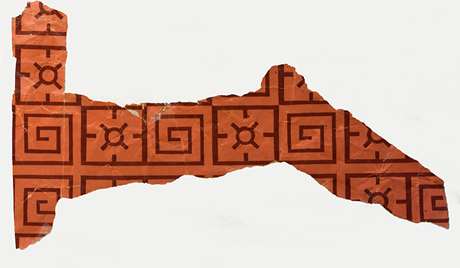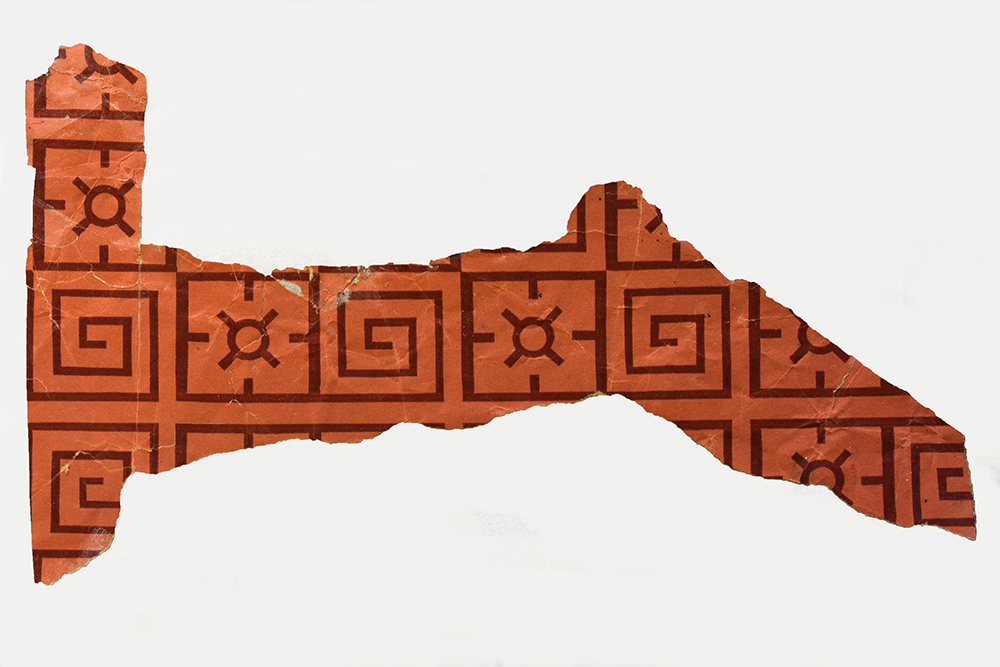 The wallpaper here dates from the late 19th or early 20th century and is an example of a dado paper (paper used to cover the lower part of the wall, between the skirting board and chair rail in passageways, halls and staircases). It bears similarities to BJ Talbert designs, who worked for Jeffrey & Co in the 1870s and 1880s. It was printed using oil-based colours and coated in a varnish to make it hardwearing. The wallpaper is machine printed in a geometric pattern in black on what was originally a pink background. Its colour has now become a dark terracotta as the varnish coating, now embrittled, has yellowed with age.