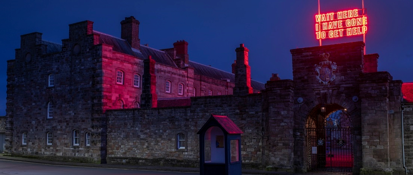 Etchells said about the work “It’s always an interesting to make work specially for a particular site. It’s a process that involves practical and quite pragmatic consideration of the location in terms of possible places to install a work as well as providing the chance to consider the different stories and ideas that are circulating in a place. In the case of the Berwick Barracks I was thinking about its origin as part of a defensive outpost, and the way it resonates with narratives of danger, attack and defence. I wanted something that would resonate strongly with the situation and the phrase used in Wait Here seemed to open lots of possible interpretations, serious and comical at the same time.”