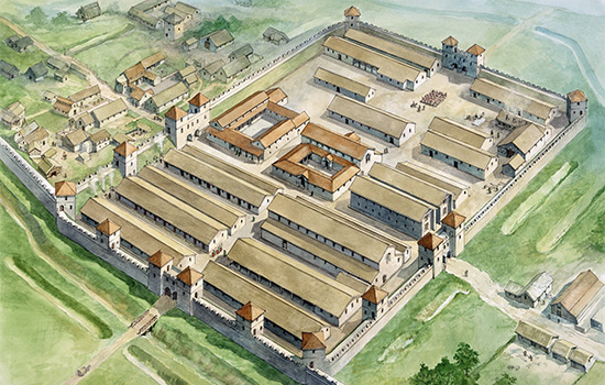 Within the excavated area lie the main west gate and the main street (via principalis). To the south of the street lie two substantial and well-preserved granaries (horrea). The area is laid out to show the important post-Roman timber buildings – one on the site of the north granary, and two smaller structures to the west – which are represented by modern timber posts.