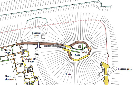 Shortly after the Norman conquest, the burh was converted into a castle to secure the island for the Norman invaders. A defended enclosure was formed in one corner of the Saxon burh by digging deep ditches within it.[2]