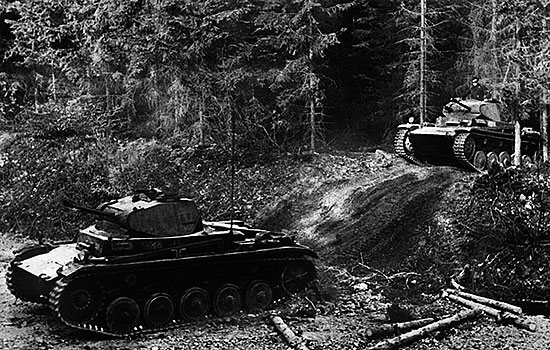 Then on 10 May 1940, two German armies moved eastward. A smaller one swept through Holland and Belgium into northern France, drawing the main Allied forces north to meet it. The other, main German force advanced through Luxembourg, broke through the French lines at Sedan, and sliced across northern France to the coast. Moving rapidly with armoured columns, these armies trapped the Allies in an ever-decreasing pocket.