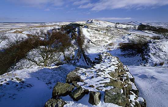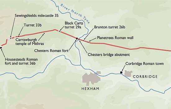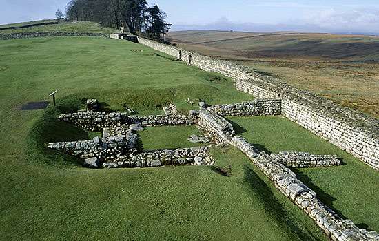 The Wall was placed slightly north of the existing line of military installations between the River Tyne and the Solway Firth. Its line was carefully chosen to make best use of the topography, and it was surveyed from each end towards the middle, or rather towards the crags, in sections.[2] Building in the east started at the point where the road from the south, Dere Street, met the Wall and where later a gate, the Portgate, was erected.