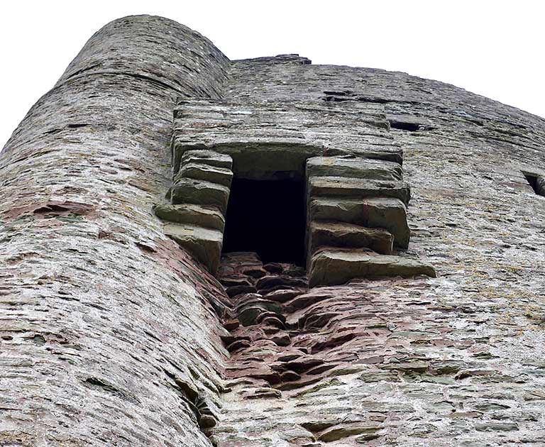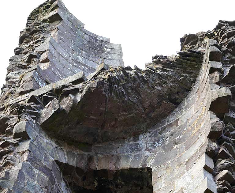 The huge open gash in the side of the keep contains the remains of a spiral staircase (originally within one of the keep’s three projecting turrets) connecting the circular rooms on each of three floors. One of the two surviving turrets contained a chimney and the other a garderobe (toilet) chamber.