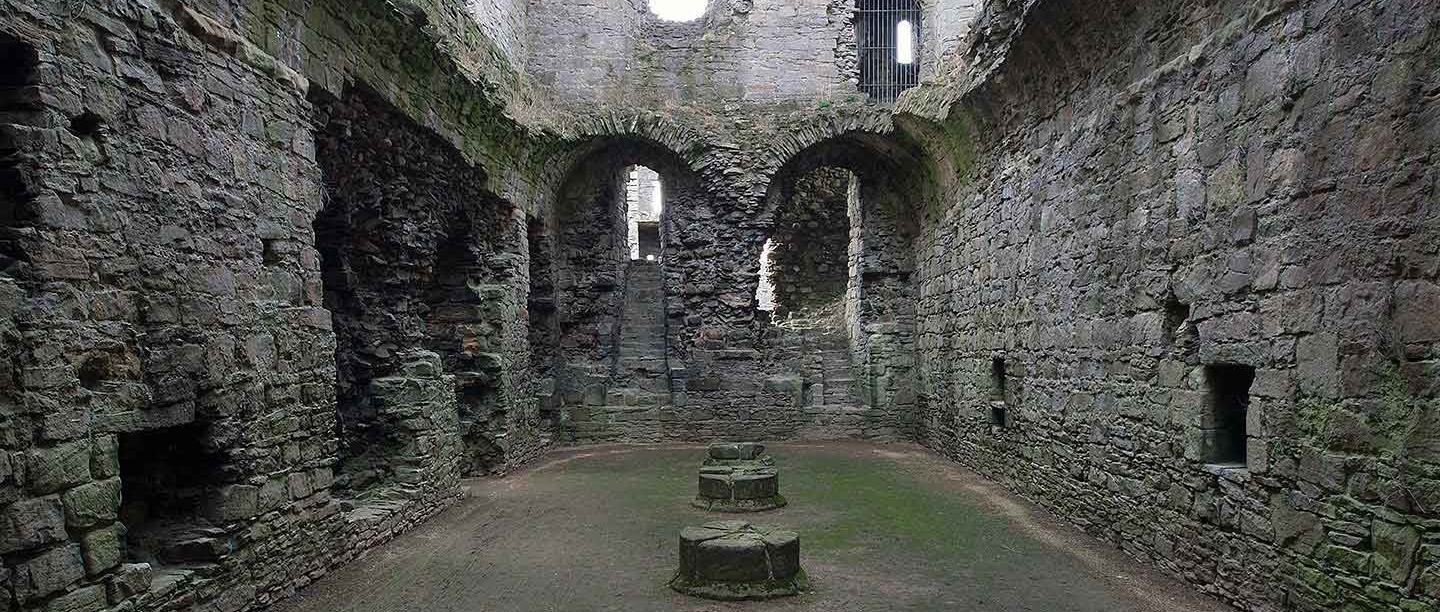 The entrance to the keep was at first-floor level via a stone stairway. Halfway up the stairway on the right is a wide recess, which would have housed a small guardroom controlling access to the keep. A drawbar socket on either side of the recess and traces of masonry survive of two sets of doors across the stairs.