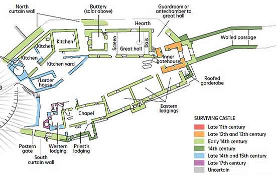 Download this PDF plan of Okehampton Castle to discover how its buildings developed over time.