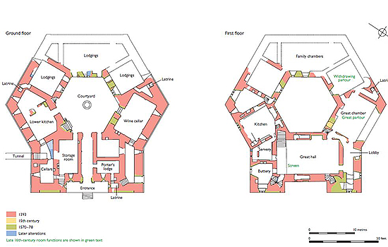 Perhaps inspired by Queenborough Castle in Kent, Wynford’s design for Lovell was a show castle of remarkable symmetry. The castle is a hexagon with a rectangle added to one side (the twin-towered entrance), with a walled outer precinct echoing the geometrical shape.