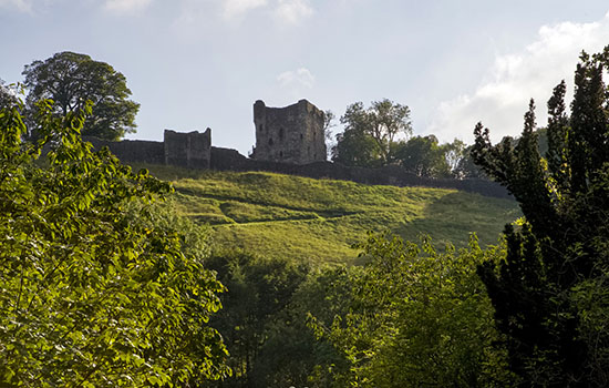 Peveril Castle towers above the pretty Peak District town of Castleton.