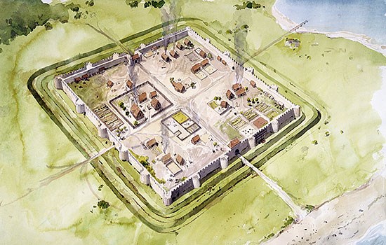 It seems clear that the fort was founded here because of its commanding position at the head of a huge natural harbour. We have no clear evidence for the date of the original fort, but coins recently found on the site date it to after about 268.[2] Given its evident relationship to the harbour, it may well be that the fort was founded by Marcus Aurelius Carausius, the man appointed by the Emperor Diocletian to command the Roman fleet in the Channel in about AD 285.
