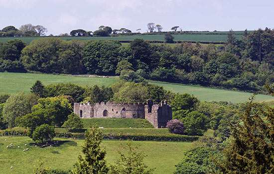 The standing ruin of Restormel Castle, formerly the castle’s inner ward or enclosure, is highly distinctive. It takes the form of a low curtain wall enclosing buildings ranged around a central courtyard. Its plan is almost perfectly circular – only one other circular castle is known in England in the Middle Ages.[1]